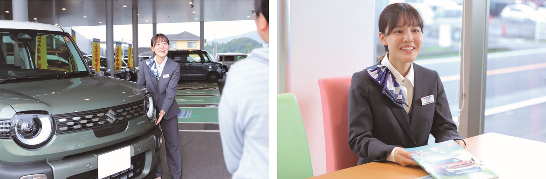 合同企業説明会で採用担当者の人柄に親しみを感じ、スズキ自販鹿児島に興味を持ちました。面接でも自然体でいられて「ここなら自分らしく働けそう」と感じ入社を決意。車の知識がなく不安もありましたが、丁寧な研修と先輩方のサポートのおかげで楽しく仕事に慣れることができました。