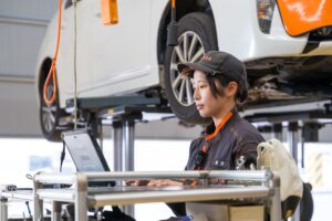 女性整備士がすでに活躍していたことが入社の後押しに。点検はもちろん、故障車の修理が完了した瞬間には大きな達成感を感じます。先輩より作業に時間はかかりますが、その分ひとつひとつ丁寧に取り組むよう心がけています。大学で1級自動車整備士の資格を取得しましたが、今後は自動車検査員やトヨタ独自の資格にも挑戦して、さらなるスキルアップを目指します。