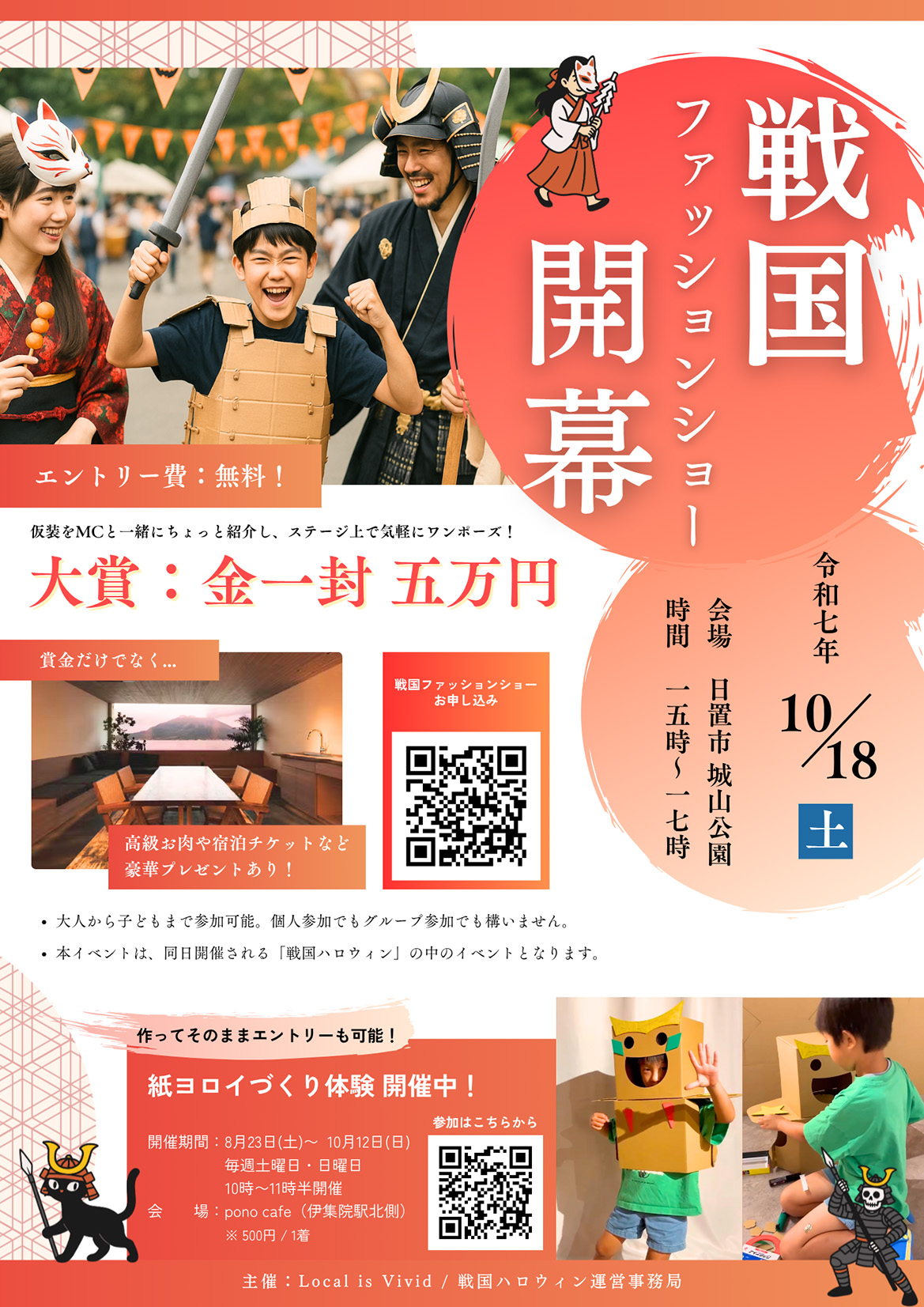 戦国をテーマにしたファッションショーやダンスパフォーマンス、ハロウィン武者行列、体験型謎解きイベントなど、この日だけの“戦国エンタメ”が1日中楽しめます。